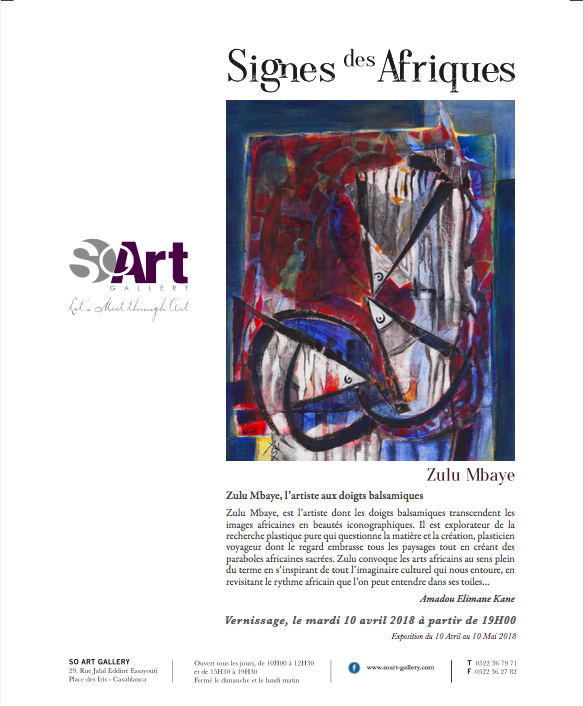 Le vernissage de l’exposition « Signes des Afriques » par Zulu Mbaye aura lieu le Mardi 10 Avril à la So Art Gallery de Casablanca à partir de 19h.