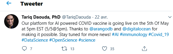 Tariq Daouda a pris part au lancement d’une plateforme web pour contribuer à accélérer l’avènement d’un vaccin contre le Covid-19. Un projet mené conjointement avec une importante équipe de recherches, composée de biologistes, de virologues et d’informaticiens. C’est dans un tweet que le fils d’Aziz Daouda, ancien Directeur technique de la Fédération royale marocaine d’athlétisme, a annoncé que le site, qui sera officiellement mis en ligne le 5 mai prochain à 17 (5/5/5pm), dévoilera l’essentiel de ses recherches.