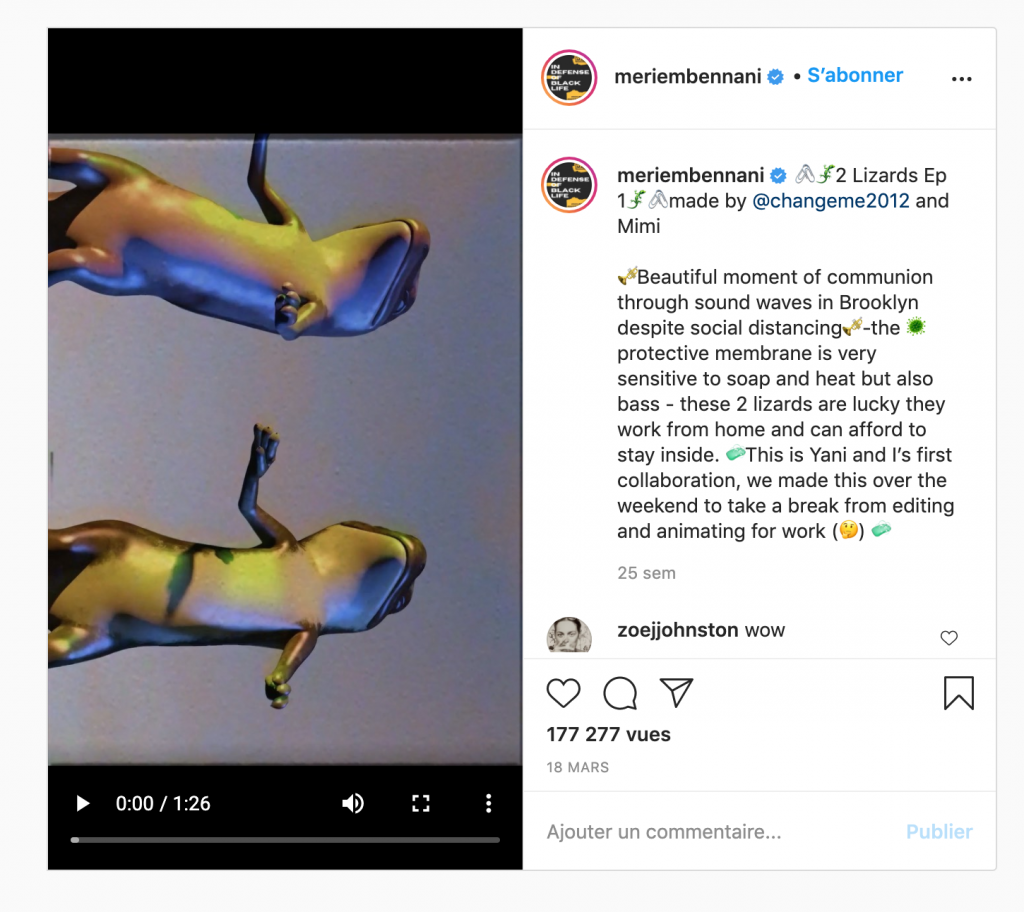 Basée à New York, Meriem Bennani est une plasticienne marocaine de renom. Elle a fait parler d’elle depuis le début du confinement en réalisant de mars à juillet avec Orian Barki, une cinéaste israélienne, une minisérie en huit épisodes baptisée «2 Lizards» et diffusée sur Instagram. Il s’agit de la chronique ordinaire de deux lézards qui font face au confinement. Il fallait y penser !