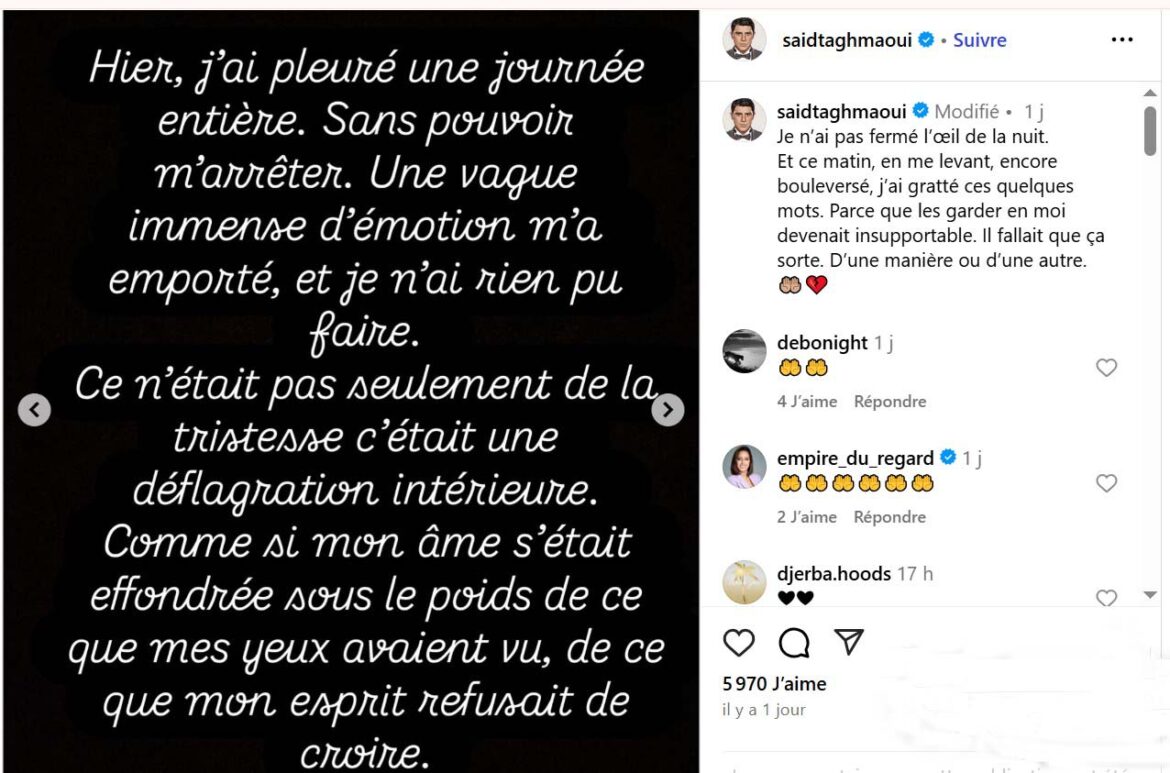 Le texte se conclut sur un engagement personnel : « Et tant que mon cœur battra, je porterai cette image. Comme une prière. Comme un cri. Comme un devoir. » À travers ses mots, Said Taghmaoui transforme une douleur individuelle en mémoire collective, une scène atroce en acte de foi. Il nous rappelle que certaines blessures ne doivent jamais cicatriser, si l’on veut encore espérer guérir le monde.