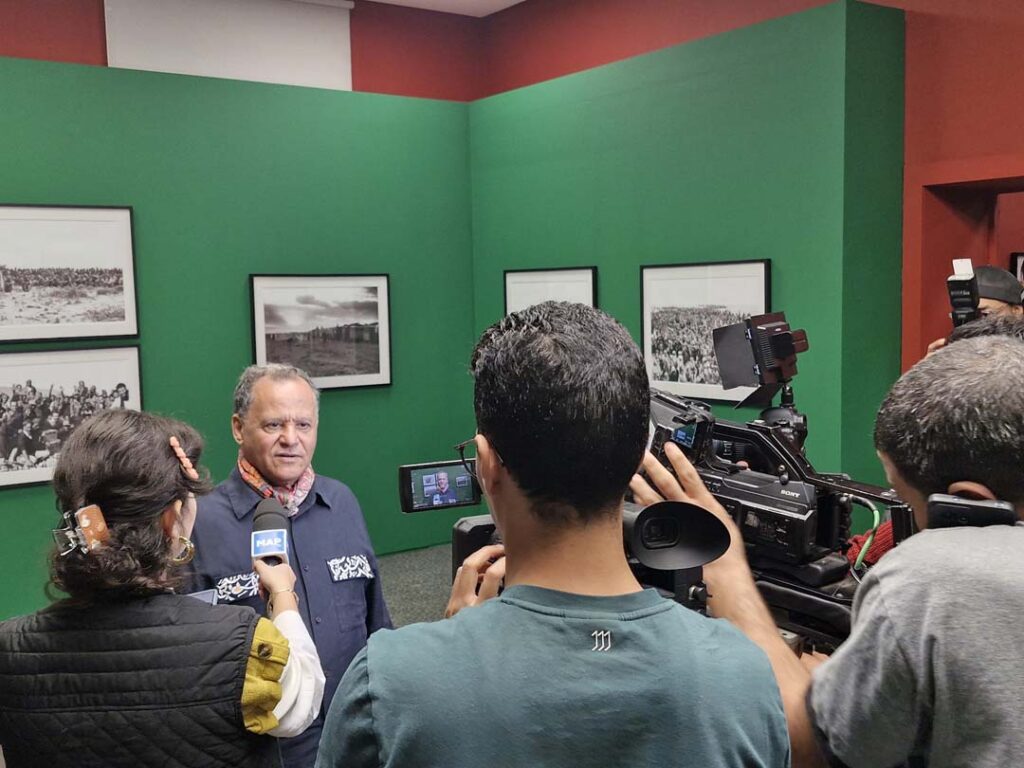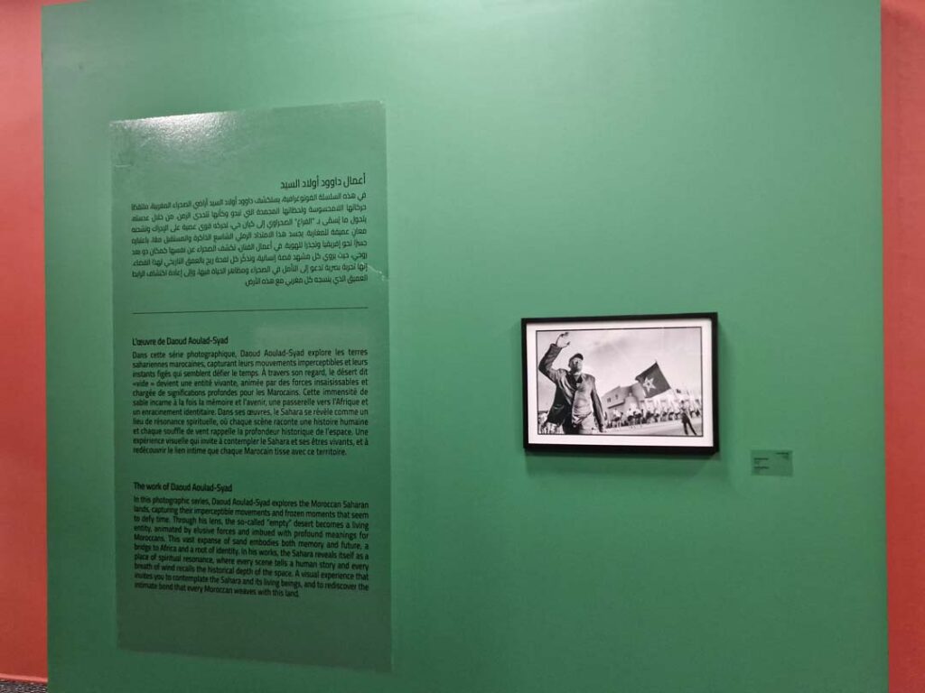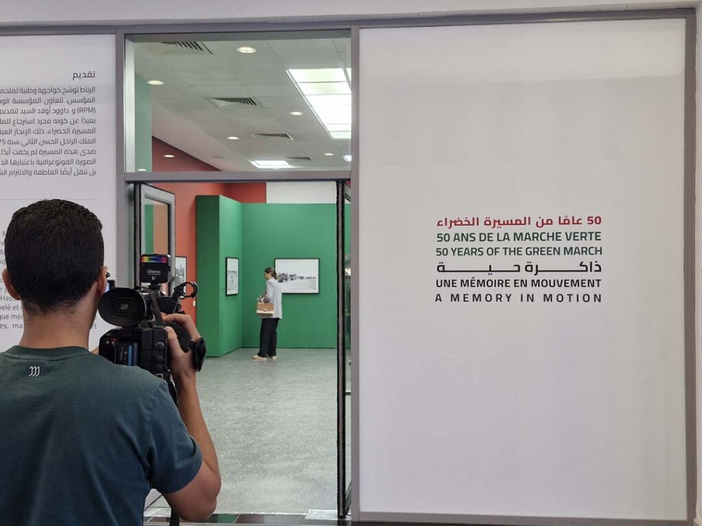 « Cette exposition célèbre la mémoire et se déploie en deux espaces, deux regards qui se répondent », souligne Nadia Sabri, directrice du Musée : « l’un rassemble des photos documentaires prises sur le vif lors de la Marche Verte ; l’autre propose une lecture artistique signée Daoud Aoulad-Syad. »