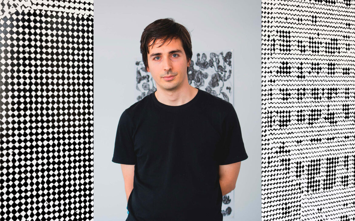 Kamil Bouzoubaa-Grivel, né en 1992 et basé à Paris, a su développer un langage visuel unique, inspiré par les trames de la bande dessinée et les systèmes d’écriture anciens. Son approche mêle habilement techniques numériques et manuelles, explorant la relation complexe entre surface et profondeur. Les dessins de Kamil, réalisés à l’encre à base d’huile sur papier couché, se distinguent par des noirs profonds et légèrement en relief, rappelant la lueur des écrans et brouillant les frontières entre 2D et 3D.