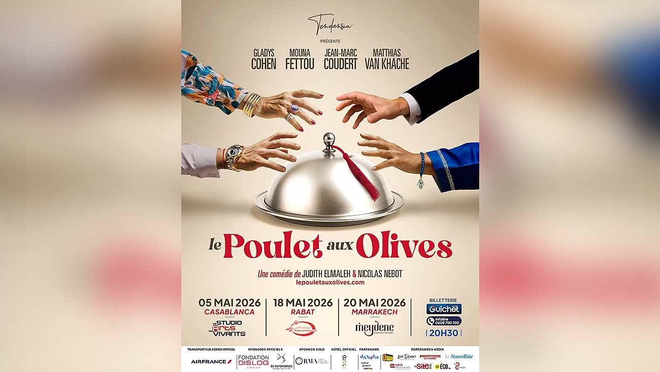 Après avoir trouvé son public en France, la comédie “Le Poulet aux Olives” s’invite désormais sur les scènes marocaines avec une tournée très attendue en mai 2026. Portée par Gladys Cohen, Mouna Fettou, Jean-Marc Coudert et Matthias Van Khache, la pièce mise sur une mécanique bien huilée, entre humour de situation et regards croisés sur les différences culturelles.