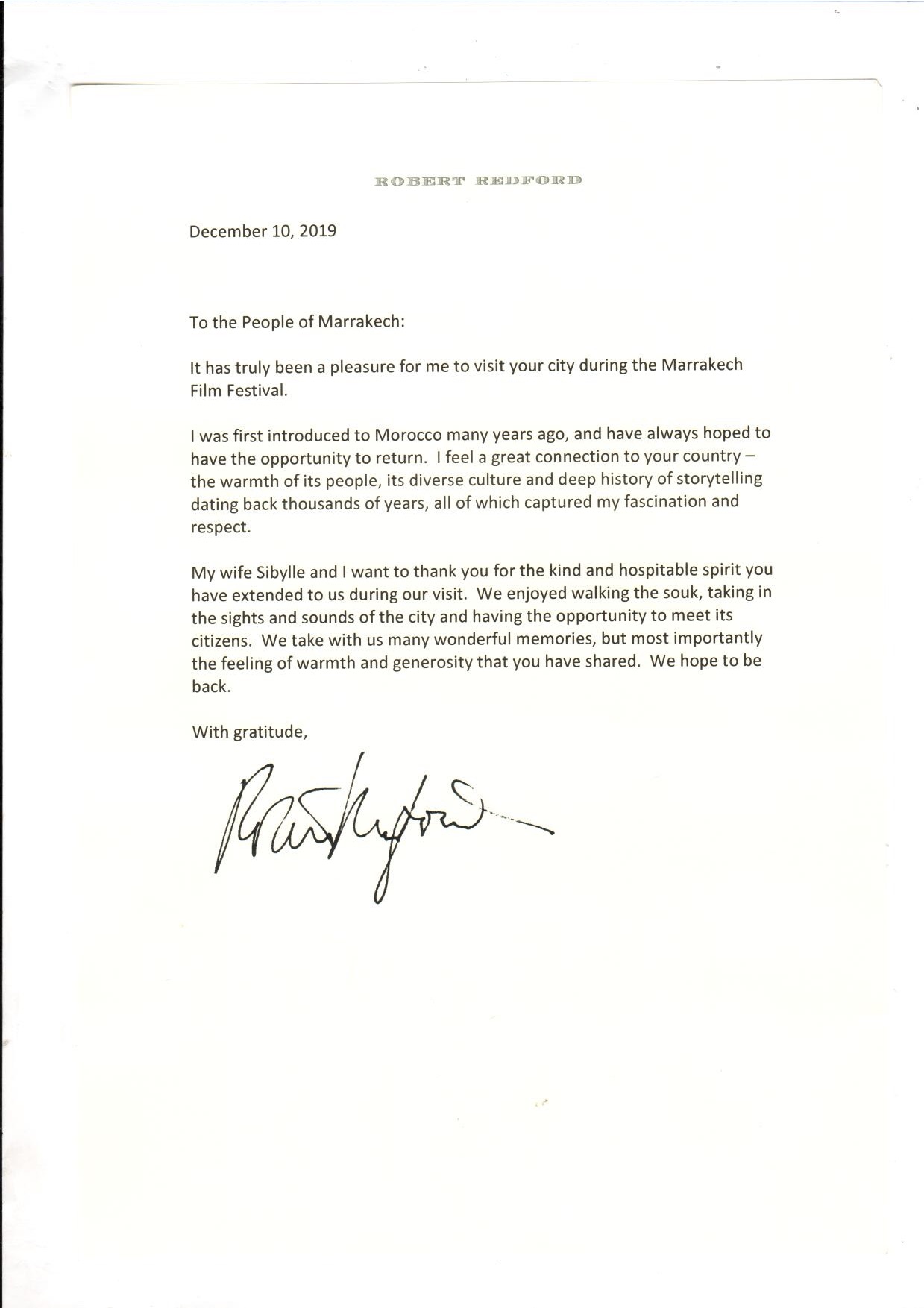 « Ce fut un réel plaisir pour moi de visiter votre ville pendant le Festival du Film de Marrakech. Je suis venu au Maroc pour la première fois il y a plusieurs années de cela et j’ai toujours eu l’espoir de pouvoir y retourner. Je ressens une grande connexion avec votre pays – la chaleur de ses habitants, la diversité de sa culture et sa profonde histoire du récit datant de milliers d’années, tout ceci a suscité ma fascination et mon respect. Mon épouse Sybille et moi – même tenons à vous remercier pour la gentillesse et l’hospitalité que vous nous avez témoignées lors de notre séjour. Nous avons aimé déambuler dans le souk, admirer les sites et les sons de la cité et avoir l’opportunité de rencontrer ses habitants. Nous emportons avec nous de nombreux et merveilleux souvenirs, mais surtout la sensibilité et la générosité que vous avez partagées. Nous espérons pouvoir revenir.