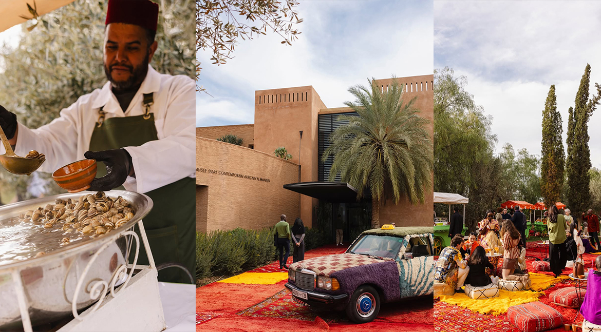 Dès l’entrée, le ton est donné. Devant la façade ocre du musée, l’architecture aux lignes épurées dialogue avec un tapis rouge revisité façon souk chic : kilims éclatants, couleurs safran et grenat, et même un taxi vintage habillé de motifs textiles. Le décor, à la fois ancré dans la tradition marocaine et résolument contemporain, plante le cadre d’une soirée où l’art déborde des murs pour investir chaque recoin. À l’intérieur, les visiteurs se retrouvent face à une installation saisissante : des dizaines de bustes en terre cuite alignés avec une précision quasi cérémonielle, comme une assemblée silencieuse observant le public. L’effet est immédiat, presque hypnotique, et rappelle combien la mémoire, l’identité et la représentation restent des thèmes centraux de la création africaine actuelle.