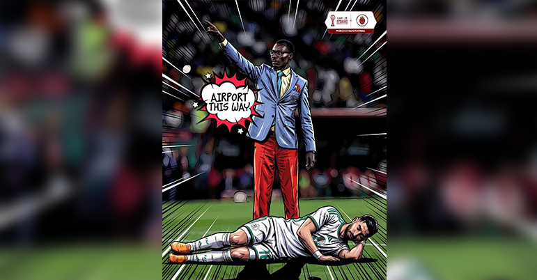 Mais le quart de finale contre le Nigéria a offert une revanche inattendue. Le supporter congolais, absent cette fois, n’a pas eu besoin d’être physiquement présent pour que son esprit plane sur la rencontre. C’est Akor Adams, buteur nigérian, qui a repris le flambeau : après avoir marqué contre l’Algérie, il a salué les tribunes dans un geste clair de respect adressé à ce fameux fan congolais. Comme une réponse élégante au chambrage de la veille. Et voilà que la toile s’empare de cette histoire avec une caricature mordante : un homme en costume pointe la sortie avec une bulle “Airport this way”, tandis que le joueur algérien est allongé, endormi. Cette fois, c’est bien lui qu’on invite à faire ses valises. Parce qu’au fond, dans le football comme dans la vie, ce n’est jamais une bonne idée de se moquer trop tôt.