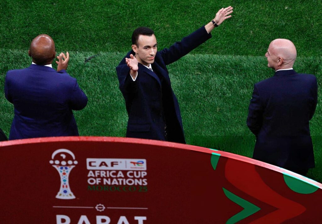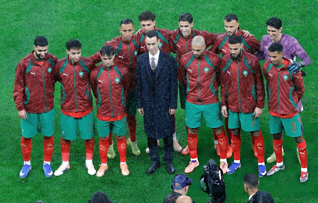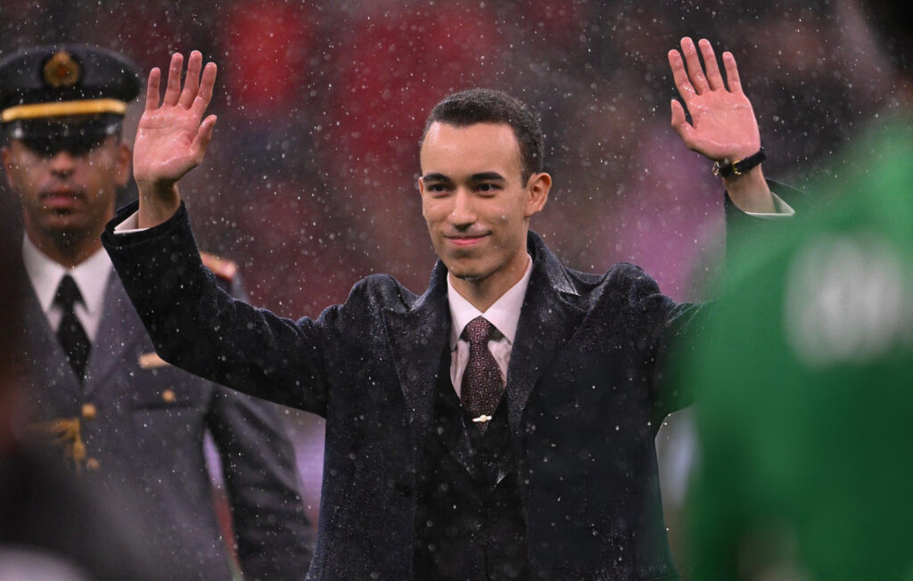 Avant même le coup d’envoi du match d’ouverture de la CAN, une scène a marqué les esprits : le prince héritier Moulay El Hassan, sous une pluie battante, est descendu sur la pelouse pour saluer les joueurs des deux équipes, sans parapluie, dans une atmosphère de grande solennité et de proximité. Un moment rare, capturé en photos, où la simplicité du geste contrastait avec la solennité de l’occasion. Ce contact direct, juste avant le début du match, a été perçu comme une image forte de proximité et d’engagement personnel.