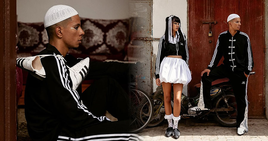Le média américain Complex dispose d’un compte mode très suivi sur Instagram, Complex Style, qui met en avant les tendances et campagnes les plus marquantes du moment. C’est là qu’une série venue du Maroc a fait sensation il y a quelques semaines, avec des silhouettes Adidas retravaillées dans des ruelles aux portes patinées et aux zelliges graphiques. Les images, shootées par la photographe marocaine Sophia El Bahja, mêlent codes street et détails locaux, entre survêtements à bandes, jupes bouffantes et dentelle blanche.