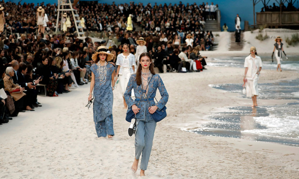 Les défilés Chanel de Lagerfeld au Grand Palais portaient autant sur la scénographie et la théâtralité que sur les vêtements. Plus récemment, pour la collection couture du printemps 2019, il a transformé la salle d’exposition en jardins d’une villa à l’italienne, avec piscine, palmiers et cyprès. La saison précédente, il avait emmené le public de la fashion week à la plage – oui, il y avait des vagues qui chevauchaient une plage de sable blanc – pour vendre sa vision de la collection du complexe. En 2014, pour le salon du prêt-à-porter automne-hiver 2014, Cara Delevingne a parcouru les allées d’un supermarché kitsch. Même sans la touche de Lagerfeld, le bâtiment est magnifique, l’un des plus beaux lieux d’art et de mode de Paris.