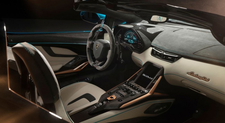 Sur le plan du style, la Sian Roadster n’a rien de nouveau par rapport au Coupé. Le modèle dévoilé hérite d’une splendide teinte de carrosserie «Blu Uranus» et les jantes bénéficient de la couleur «Oro Electrum» que Lamborghini a choisie pour identifier ses modèles électrifiés. Dans l’habitacle, l’ensemble des éléments sont blancs. On retrouve également des détails en «Blu Glauco» et en aluminium «Oro Electrum».