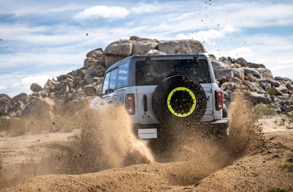 Pour la première fois sur un Bronco, la configuration standard associe des pneus tout-terrain de 33 pouces à une suspension haute capacité. Ce dispositif améliore la stabilité à haute vitesse et confère au véhicule une posture plus large et plus affirmée.