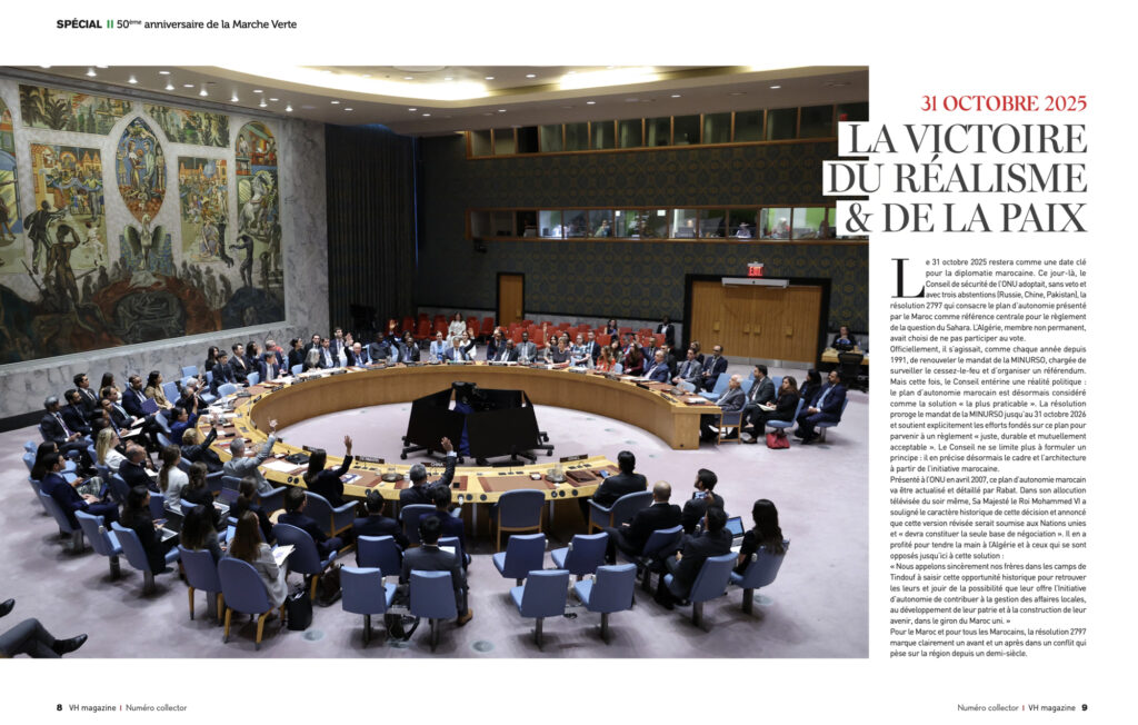 Le 31 octobre 2025 restera comme une date clé pour la diplomatie marocaine. Ce jour-là, le Conseil de sécurité de l’ONU adoptait, sans veto et avec trois abstentions (Russie, Chine, Pakistan), la résolution 2797 qui consacre le plan d’autonomie présenté par le Maroc comme référence centrale pour le règlement de la question du Sahara. L’Algérie, membre non permanent, avait choisi de ne pas participer au vote.